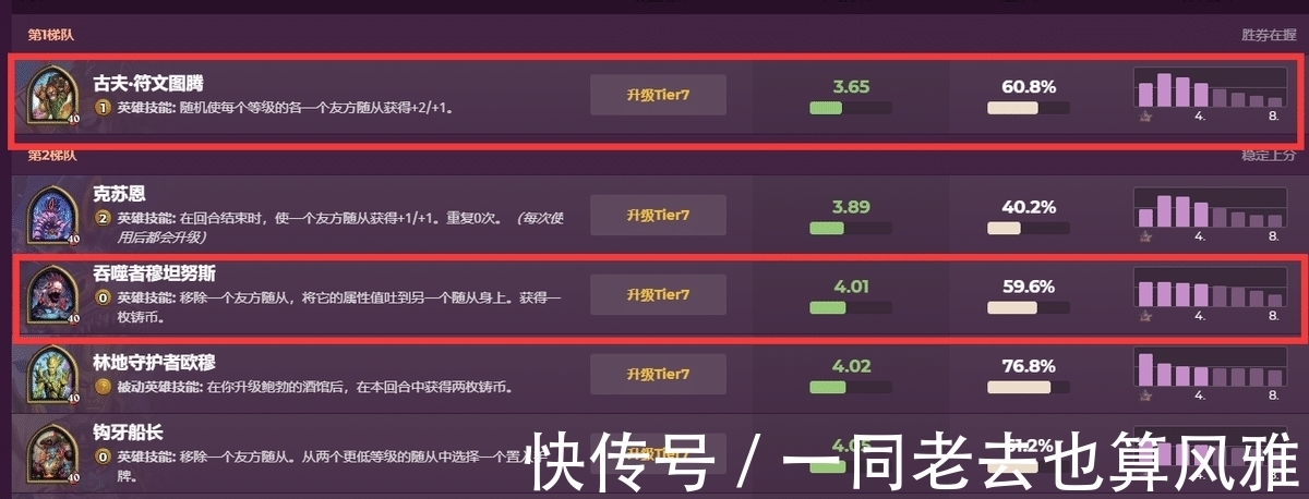 20.4补丁中,酒馆象棋模式移除了英雄“玛维·影歌”,并推出了贫瘠之地的两个新角色,分别是:“吞噬者穆塔努斯”(燕子[消耗0薄荷]——移除一个友方随从并吐出其属性价值另一个仆从。获得一个薄荷)和“古府·符文图腾”(自然平衡[消耗1个薄荷]——随机使每个等级的每个朋友获得+2/+1)。两位新英雄不仅增加了游戏的可玩性,也拓宽了玩家的思维。最终,古夫凭借自身的技术实力和卡池随从的契合度排在了当前版本的胜率T1梯队,而“得力手”鱼人在T2梯队中也名列前茅。